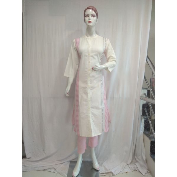 Women Self Design Cotton Straight Kurti Pant Set (White Pink)