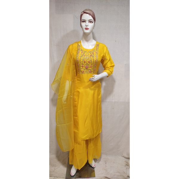 Women Yellow Embroidered Silk Kurta Sharara Dupatta Set