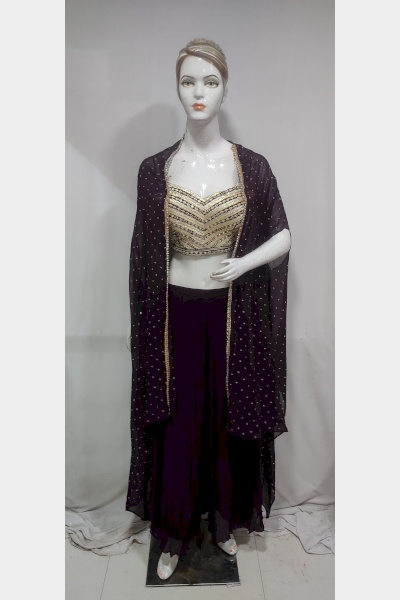 Women Wine Colour Pure Georgette Shrug Top Pant Set