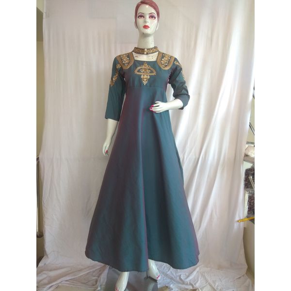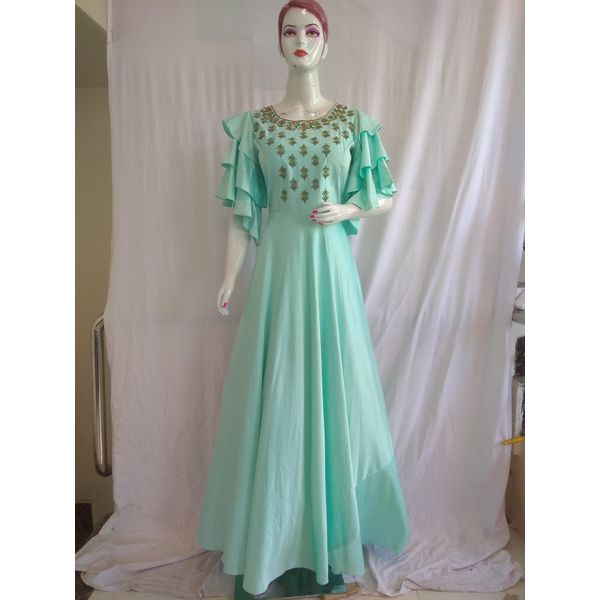 Women Satin Silk Designer Gown With Stylish Sleeves (Firozi)