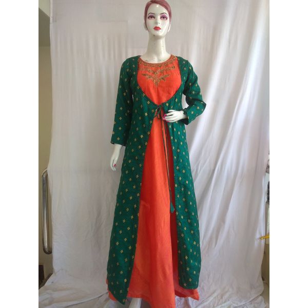 Women Silk Blend Embroidered Gown With Ethnic Jacket(Orange Green)