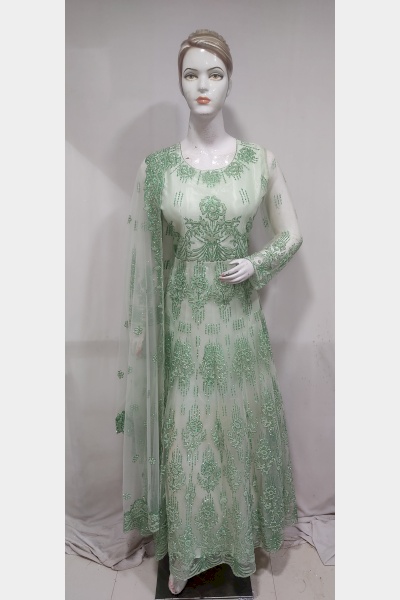 Women Green Embroidered Net Long Gown