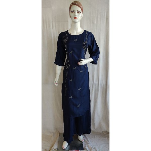 Women Blue Embroidery Silk Kurti Crush Plazo Set