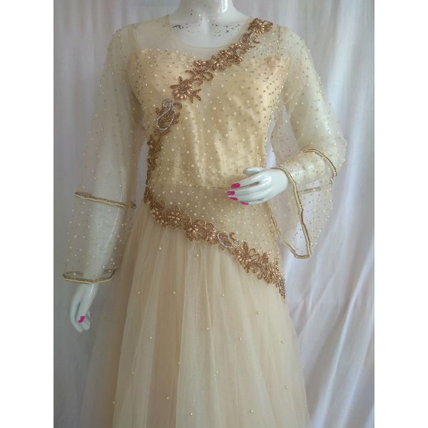 OMBs beige colored pearl embroidery net gown promises for latest fashion, elegant look, trendy designs and finest quality fabric.Our Only objective to provide you an unique designer collection with best fabric and fitting kurta that enhance your beauty and bring smile on your face.This Multipurpose very comfortable kurti is useful for all occasions festivals, offices, parties and in daily wear at very reasonable price.