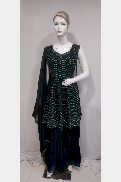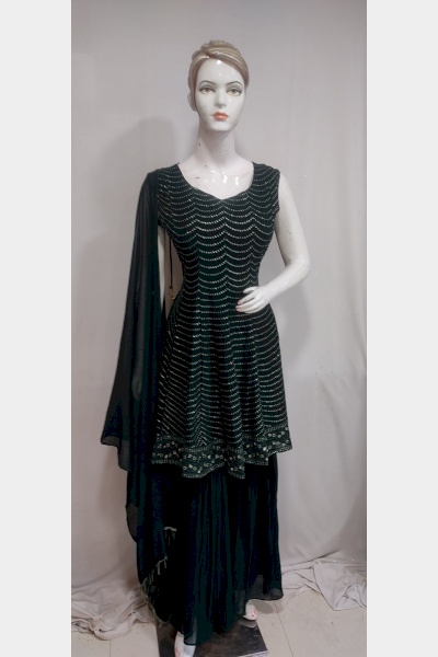 Women green embroidered georgette short kurta sharara dupatta set promises for latest fashion, trendy designs and elegant look. Our unique designer collection with best fabric and fitting outfits enhance your beauty. This Multipurpose very comfortable kurti is useful for all occasions festivals, offices, parties and in daily wear at very reasonable price.
