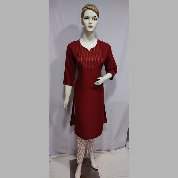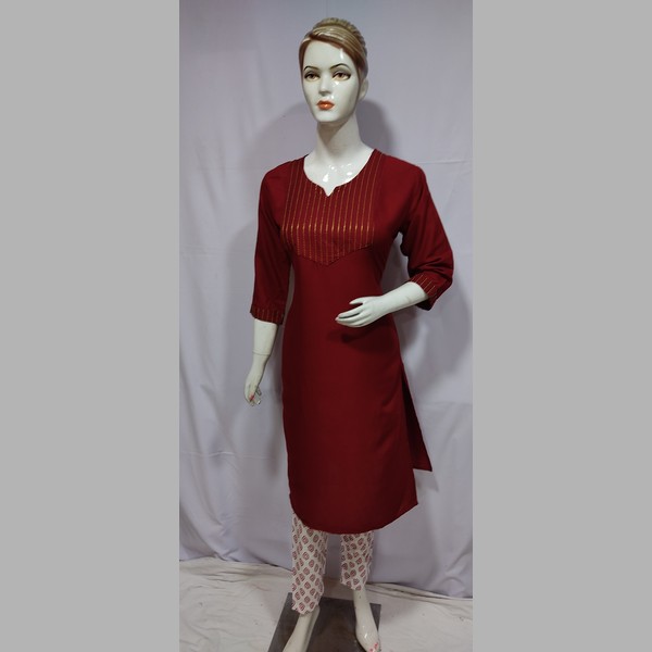 Women maroon rayon kurta plazo set promises for latest fashion, trendy designs and elegant look. Our unique designer collection with best fabric and fitting outfits enhance your beauty. This Multipurpose very comfortable kurti is useful for all occasions festivals, offices, parties and in daily wear at very reasonable price.