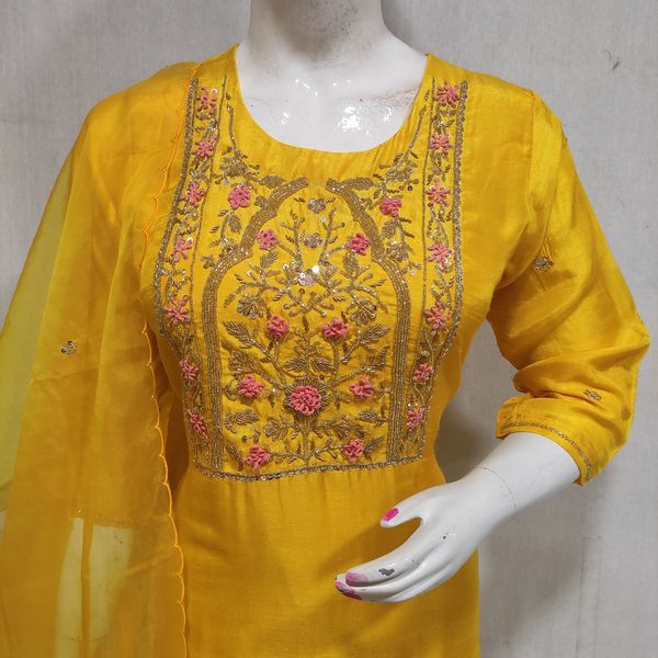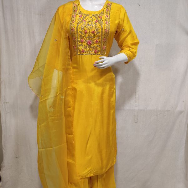 Women yellow embroidered silk kurta sharara dupatta set promises for latest fashion, trendy designs and elegant look. Our unique designer collection with best fabric and fitting outfits enhance your beauty. This Multipurpose very comfortable kurti is useful for all occasions festivals, offices, parties and in daily wear at very reasonable price.