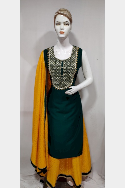 Women Green Embroidered Silk Straight Kurta Skirt Dupatta Set