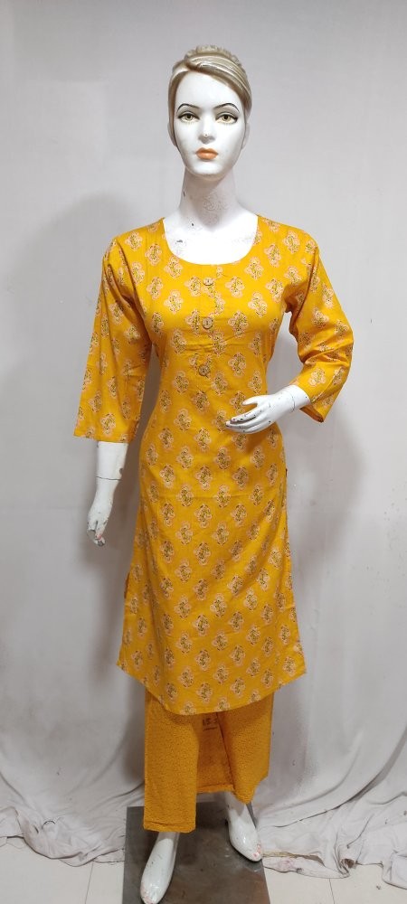 Women Mustard Printed Cotton Straight Kurti Pant set