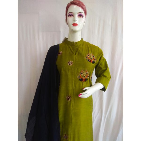 Women Muslin Silk Embroidered Designer Kurti Dupatta Set(Emerald Green)
